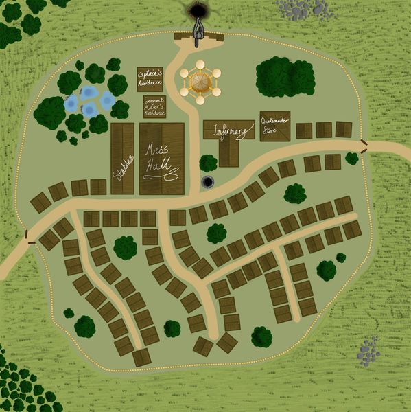 When they arrive at Fort Daylight, they are greeted at the gates by a male Tiefling soldier named Corporal Garrick Halloweave. He is very welcoming and simply asks for their names and the intended duration of their visit. He does not ask them to surrender their weapons, and invites them to attend to the Mess Hall, where they can meet the Fort's Captain and Sergeant Major, who will arrange accommodations for them. They see, to the North of the fort, a huge statue of a woman, dressed in spartan armor, kneeling and facing out from the garrison, with arms outstretched (as if trying to catch rain), over the edge of the garrison walls.