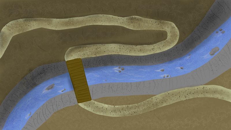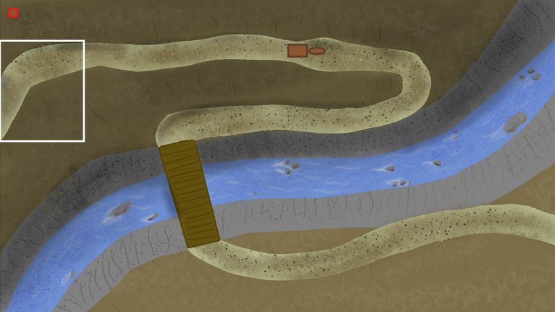 Note that this road is on the edge of a steep hill / cliff. The first section of road (with the white box, and brown box and oval representing the horse and cart) is about 30 feet higher than the second section (the part connecting to the bridge), and there is a 100ft drop from the bridge to the water below.