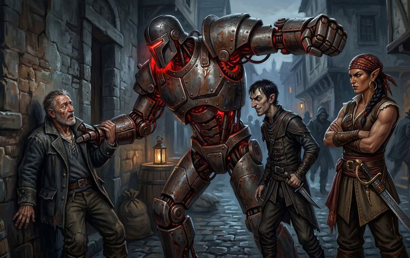 As you round a corner you see a somewhat disturbing sight: an older man, perhaps in his late fifties, with short greying hair and the deep wrinkles earned by countless long days at sea, cowers against the wall of a building while a ten-foot-tall steel monstrosity towers over him threateningly. It is humanoid in shape, but doesn’t show any signs of awareness or intelligence, rather a red glow emanates from between its joints and from the slit in its helmet-like head where its eyes would be. The golem – if that is indeed what it is – is holding tightly onto the man’s arm with one hand, while the other is cocked back, as if poised to strike a devastating blow.