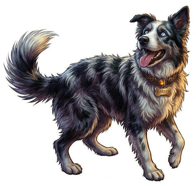 As he walks in the door he is greeted enthusiastically by an over-excited dog, medium sized, with black, white and grey fur, and light blue eyes. Its spine curves slightly to the left, causing its back legs to be noticeably (but not awkwardly) misaligned to the rest of its body, something that is accentuated by the shaking of its rear end, seemingly being moved involuntarily by the enthusiastic waggling of its bushy tail.