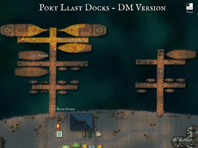The following is the DM version of the map, it shows the location of the Fire Elemental, the Bilge Golem and Needle, in addition to identifying which parts of the docks are currently ablaze when the characters first arrive.
