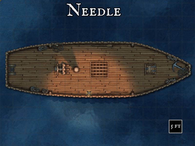 As the characters deal with moving Needle away from the Port Llast docks (at which time all jobs should be completed except manning the sweeps and dousing spot fires), another Bilge Golem climbs up over the railing of the cog and onto the deck, attacking the party. Characters must now divide their efforts between fighting the Bilge Golem, dousing spot fires, or rowing Needle away from the docks to prevent further fires taking hold. The following is a map of Needle which can be used in a virtual tabletop. You, as the DM, can choose where the Bilge Golem climbs onto the deck of Needle.