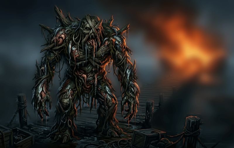 It's then that you notice a distinct lack of people working to fight the fire, and the cause is immediately apparent. At the base of the pier stands a huge monstrosity. Roughly humanoid in shape, it's body appears to be constructed of a fell mixture of driftwood, bilge water, seaweed and fish guts. It stands around 12 feet tall; its bulk taking up the full width of the pier and making it impossible to move past. A ship-hand, daring to be brave, attempts to dodge around the creature but it extends a massive arm, both striking and engulfing the man, then throwing him back roughly onto the pier. All remaining onlookers seem to have concluded that further attempts to access the docks and fight the fire would be fruitless, and they stand back watching in awe as the bright flames leap about the end of the pier.