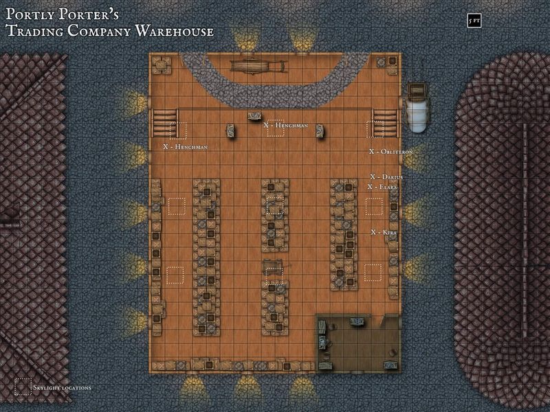 The following map should be viewed only by the DM, it displays the Portly Porter's Trading Company warehouse (as above) but with the starting positions of Darius, Elara, Obliteron, Kira and two additional henchmen that Darius has enlisted to help him. Th location of skylights is also indicated by dotted squares. Darius and his crew will focus their attention mostly on the doors at the top of the warehouse on the map, however they will occasionally glance around at windows, they generally won't bother to look up at skylights, however.